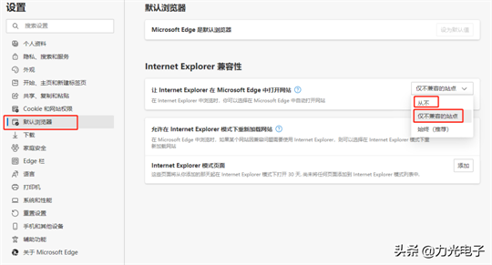 5、点击默认浏览器,将internet Explorer兼容性修改为【从不】或【仅不兼容的站点】。