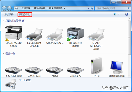 接下来我们就可以添加打印机了。打开“设备和打印机”,点“添加打印机”。