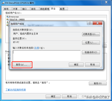 接着会弹出“选择用户和组”对话框,在这个对话框中点“高级”。