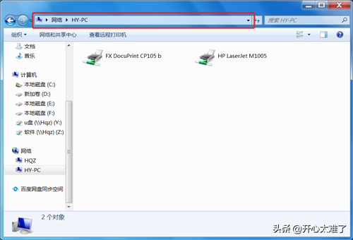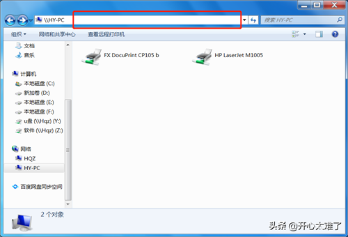 打开这个计算机以后,点一下地址栏后面的空白处,就看到这个网络地址了。把这个地址复制粘贴到添加凭证网络地址的输入框里面就可以了。顺便说一下,双击下面的打印机图标也可以直接连接添加共享打印机。