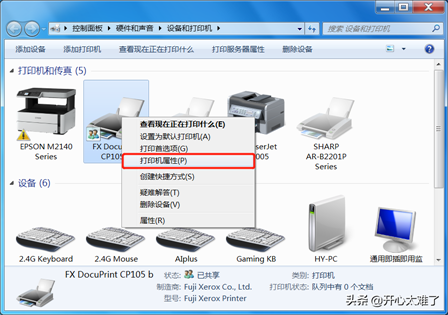 再说一下怎么设置打印机的安全属性吧。用户权限设置不合理也是造成打印机无法连接的一大原因。打开“设备和打印机”,在共享的打印机图标上按右键,点击“打印机属性”。