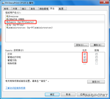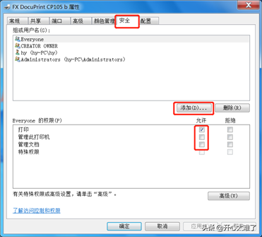 在打印机属性中,点“安全”选项卡。点“添加”,添加用户或组。