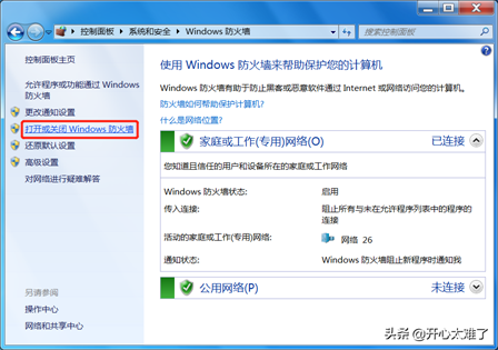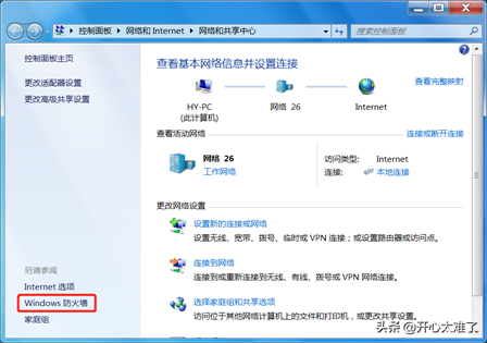 顺便说一下怎么关闭网络防火墙吧,这个也是共享打印机不能连接的一个主要原因。首先打开“控制面板”,然后点开“网络和共享中心”,点击下面的“windows防火墙”。