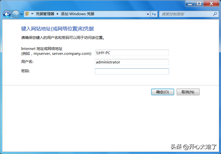 在这里输入“网络地址”“用户名”和“密码”。然后点“确定”就完成了。不知道怎么查找网络地址的小伙伴们往下看,后面会介绍怎么查找网络地址。用户名填写提供共享打印机电脑的管理员用户名,一般默认是Administrator。在提供共享打印机的电脑上查看。密码就不用说了吧。