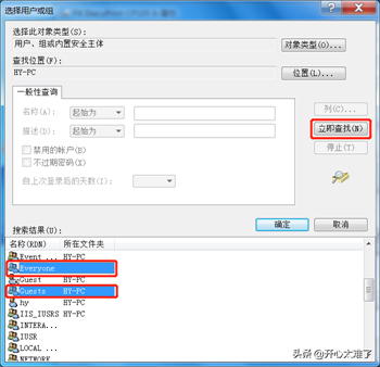 在高级中点击“立即查找”,在搜索结果中找到“Guests”来宾组和“Everyone”所有人组,按住键盘上的“Ctrl”键选择这两个组。然后点“确定”。