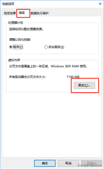 第三步:打开性能选项后,点击“高级”选项卡,在虚拟内存下面点击“更改”