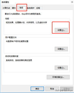 第二步:打开系统属性页面后,切换至“高级”选项卡,在性能框中点击“设置”