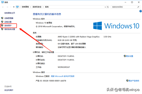 第一步:在桌面右键点击“此电脑”,选择“属性”;进入系统界面后,点击窗口左侧的“系统保护”