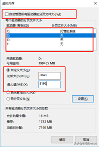 首先取消“自动管理所有驱动的分页文件大小”的勾选,接着选择除C盘以外的其他分区,点击“自定义大小”,将初始大小设置为2048,最大值设置为8192
