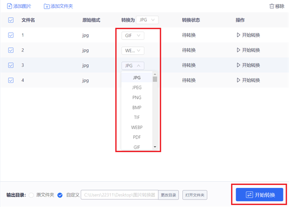 图片添加好后,你可以选择每一张图片转换成不同的图片格式,也能统一转换成同一个图片格式,选择好就可以转换了。
