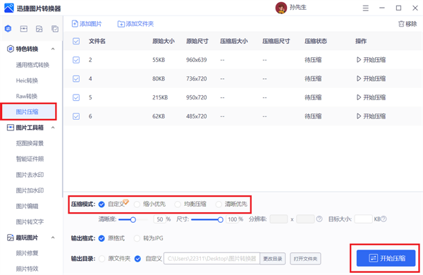 图片太大,上传网上的时候会被限制,将整理好的图片导入到图片压缩功能,压缩模式有四种:自定义、缩小优先、均衡压缩、清晰优先,选择自己需要的压缩模式就可以转换。