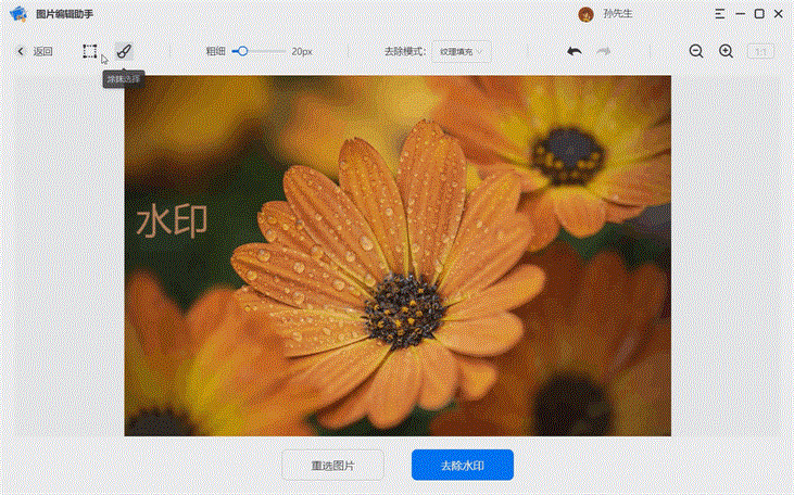 这个功能可以消除任意位置的图片水印,你可以选择涂抹或矩形框的方式来选中水印,能够选择多处水印进行去除。
