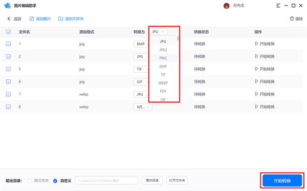 在工作的时候,我们也需要把图片转换到固定的格式才能完成任务,点击格式转换功能,支持上百种图片格式添加,可以选择每张图片转换成不同格式,也能统一转换为同一个格式。