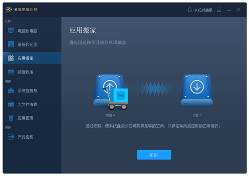 易我电脑迁移是一款实用的数据迁移软件,适用于Windows 10/8.1/8/7/Vista/XP系统,界面简约,功能强大且操作简单。支持将空间不足的磁盘上的应用程序迁移到其他分区或磁盘,释放磁盘空间;支持在两台电脑之间传输数据,不仅能将旧电脑的文件/文件夹迁移到新电脑,还能将旧电脑上的应用程序和Windows账号也一并迁移,而无需在新电脑上重新安装和设置,大大节约了用户的时间;软件还提供备份和还原功能,备份电脑上的程序、文件和账号,避免因数据意外丢失而带来的损失,同时,备份的生成的镜像文件还支持在另一台电脑上进行还原,起到迁移数据的作用;还可以通过连接旧电脑的磁盘,将无法正常工作的旧电脑中的应用和数据完整迁移出来;除此之外,软件还提供系统盘瘦身、大文件清理以及应用管理功能,帮助用户更好地管理磁盘数据。