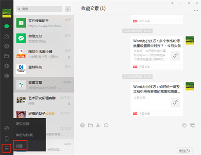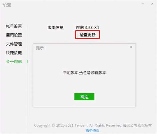 单击微信工作界面左侧列表下方的三条横线,在弹出的列表中单击“设置”。接着在打开的“设置”对话框中选择左侧列表中的“关于微信”,在右侧就会显示当前的版本信息,单击“检查更新”按钮可以查看当前版本是否是最新版本。如果不是最新版本,将其升级为最新版本。