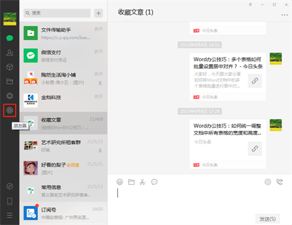 3.关闭“设置”对话框,返回微信工作界面,在左侧列表中找到“朋友圈”图标(见红色方框标注处),鼠标单击即可打开朋友圈查看信息。