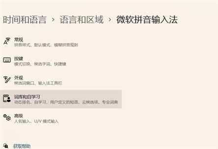 进入微软拼音输入法的设置界面,选择词库和自学习选项
