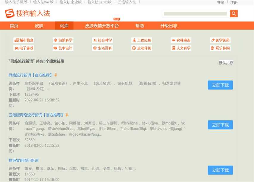 点进去搜狗输入法的官网后,随便下载一个词库文件,我们下载一个网络流行语的词库