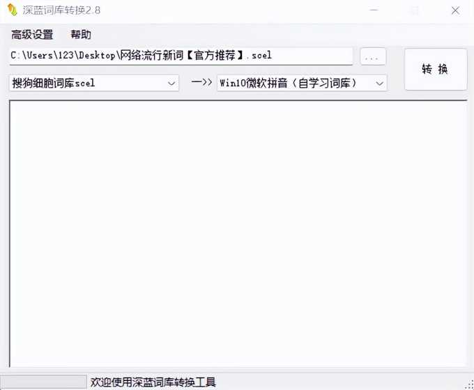 下载下来的词库是scel格式的,只能导入搜狗输入法里,可是使用【深蓝词库转换】就可以将之转换为微软拼音输入法的dat格式。