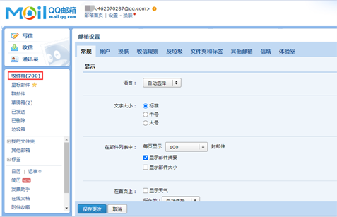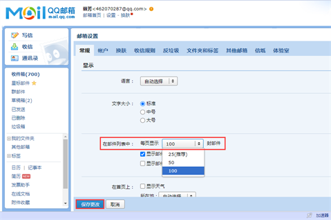 2 在打开的“邮箱设置”界面中,在“常规”选项卡下的“显示”中,设置“在邮件列表中:每页显示100封邮件”,目前最多支持每页显示100封邮件,最后单击下方的“保存更改”按钮。
