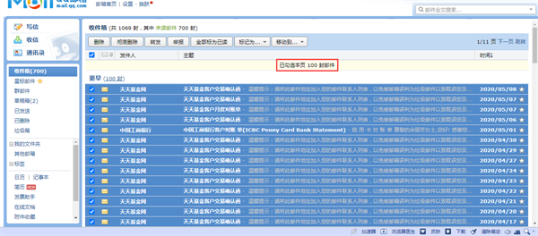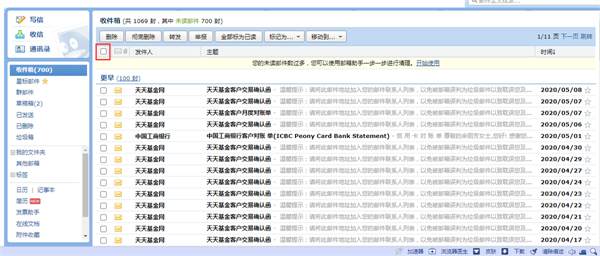 4 单击“收件箱”界面上方的白色方框将其勾选,就能一次性快速选中当前页的100封邮件,再点击“删除”按钮就能进行批量删除,加快清理邮件的速度。