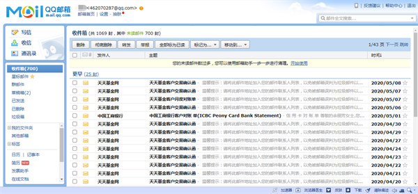 下图QQ邮箱收件箱中共有1069封邮件,当前邮箱每页显示的邮件数是25,收件箱所有邮件一共有43页。现在如果想对QQ邮箱进行清理,将这43页邮件全部删除,还是比较费时间的。如果我们将邮箱每页显示的邮件数量增多,就可以在一定程度上减轻工作量。