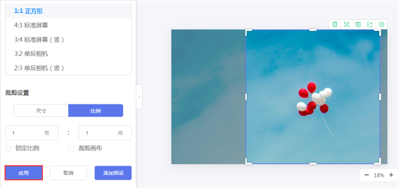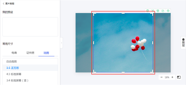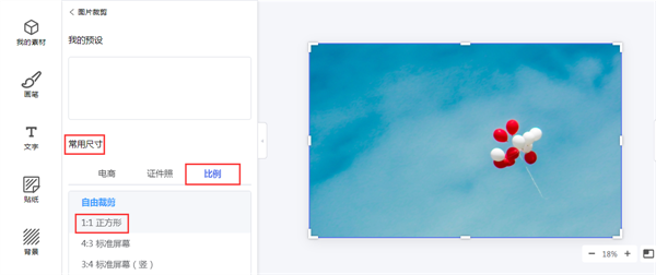5.在打开的“图片裁剪”窗格中,选择“常用尺寸”下的“比例”选项卡,再单击选择“自由裁剪”下的“1:1正方形”。此时,图片中会出现一个四角为白色直角的裁剪框。