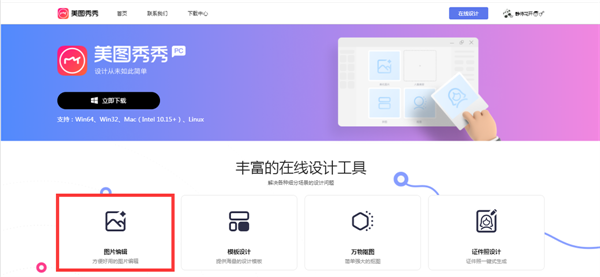 1.网络搜索打开美图秀秀网页版官网,在首页找到“图片编辑”选项进行单击。
