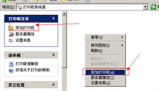 第三种:在开始菜单里打开 打印机和传真 之后在空白处右键选择添加打印机(如图3-1所示)或者在左侧常见任务区域里找到添加打印机是一样的(如图所示) 调出打印机向导。