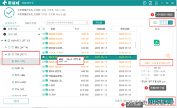第二步:如图所示,单击左侧的文件类型,窗口就会此显示软件扫描的该类型文件,单击扫描出来的文件你可以查看它的路径,完成查看后就能进行文件的恢复了。
