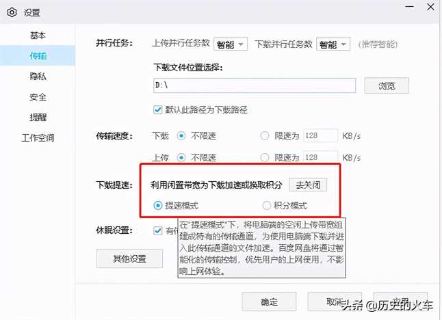 仅限在PC端,打开设置-传输里,打开下载提速,选择提速模式。根据说明,该功能仅对PC端有效,据说对热门文件的效果好些。个人试用未觉察到效果,可能下载的是自己的资料的原因吧。对于经常下载热门资源如电影、视频等的朋友可能有一定的作用。打开后会在闲时利用你的宽带上传,介意的就算了。