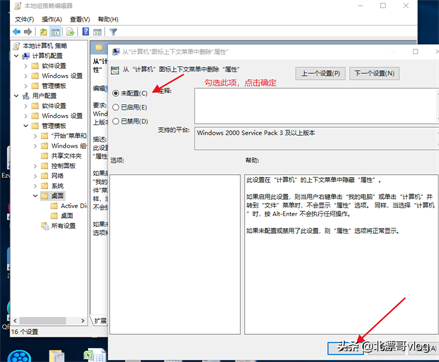 3、进入从“计算机”图标上下文菜单中删除“属性”后,设置为“未配置”或者“已禁用”,再点击: 确定。