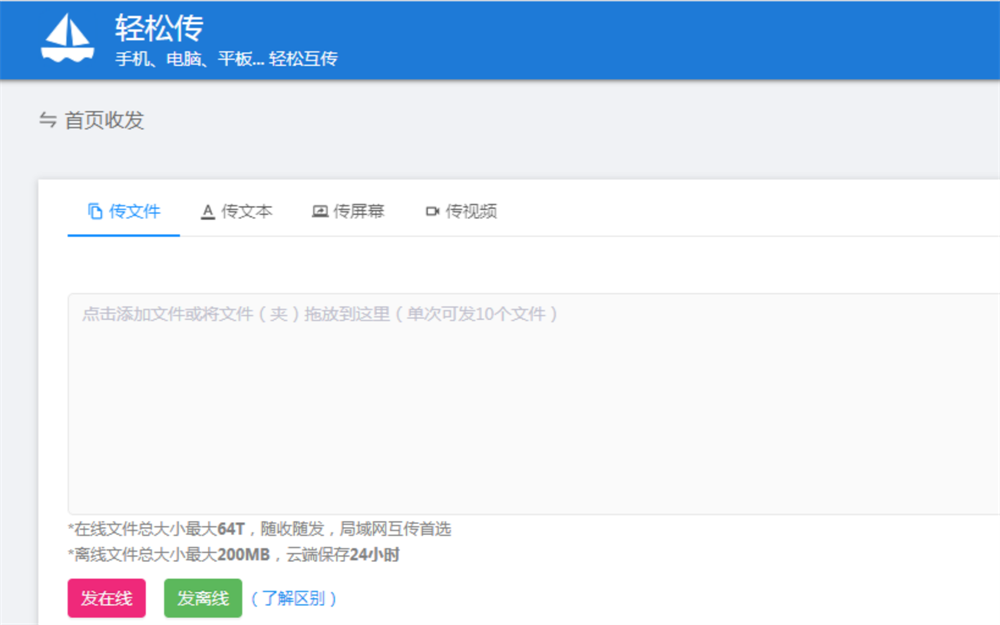 这是专门针对个人文件或文本片段的跨设备互传,无需安装配置,随时随地打开网页就能传。支持两设备之间点对点直传,无限速,最大支持64T超大文件。
