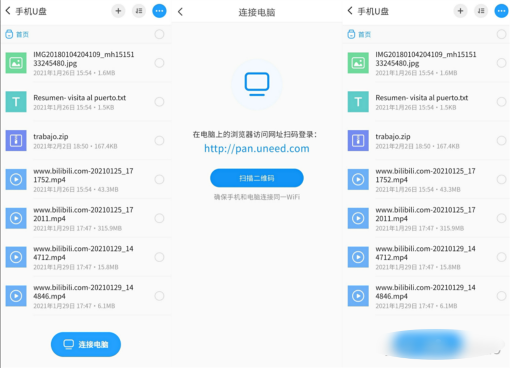 a. 将要传输的文件上传至与你APP的手机U盘中,然后在电脑上进入 http://pan.uneed.com, 扫码登录;