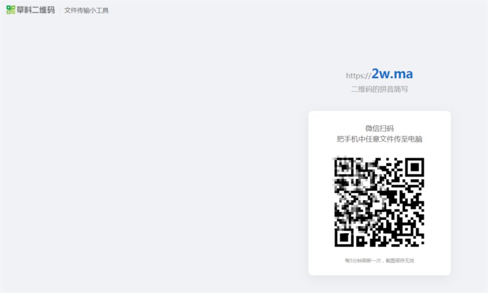 草料二维码是一款专门为手机和电脑传输文件的小程序,而且操作非常便捷,PC打开,手机扫码就能够从手机上向电脑传输文件,而且界面非常简洁,没有广告。