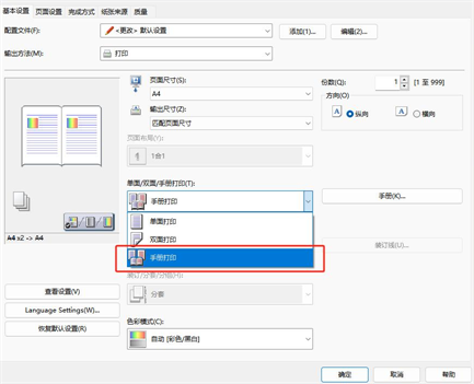 - 在打印机属性设置页面中,找到“手册打印”相关选项(不同打印机的名称可能略有不同),勾选该选项后,点击【确定】回到打印界面。