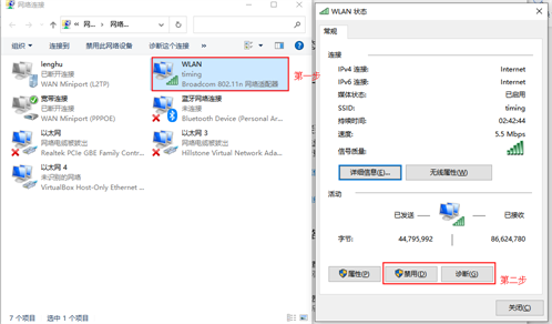 ③第三步,查看网卡状态,可以试着将网卡禁用后,然后再次启用,看故障是否解决一般问题都能解决。也可以使用诊断按钮,会自动禁用和启用网卡。