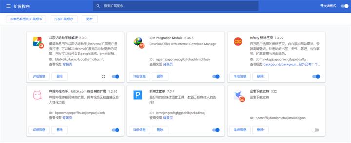 除了通过插件商店安装,我们还可以选择手动安装。以Chrome浏览器为例,首先在第三方插件网站下载想要安装的插件包,从浏览器的设置->更多工具->扩展程序 打开扩展程序页面,打开扩展程序页面的“开发者模式”,然后把后缀名为crx的插件拖放进扩展程序页面,即可完成安装。