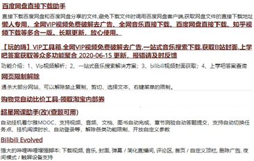 这是一个脚本管理插件,有了它就可以安装脚本,脚本也是类似于插件的东西,但更轻量化,使用脚本可以代替许多插件的功能,避免安装太多插件使浏览器变得臃肿。下面是脚本下载网站的截图,从标题就能看出功能有多丰富了。