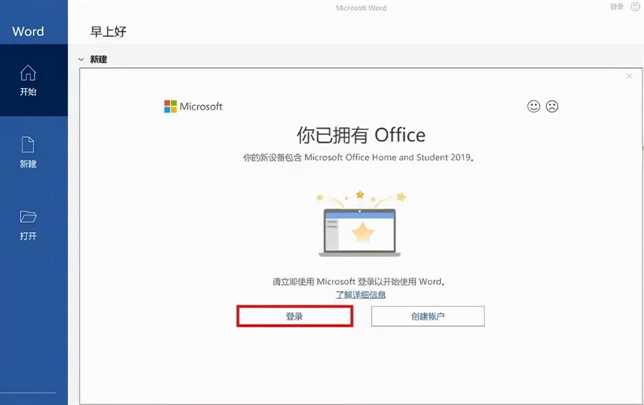 首先,打开任意一款Office软件,比如说打开Word之后,我们需要点击“登录”,如果你还没有微软账户,请点击“创建账户”。