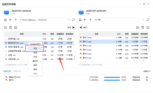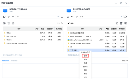 3.传输文件也很简单,从公司电脑上找到要传输的文件,右键点击“接收”,即可将文件传输到家里电脑上,很方便!