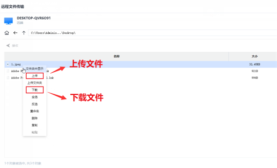 7.文件传输界面略有不同,「上传」和「下载」都在右键弹窗下,操作起来也很方便。