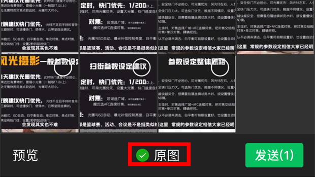 第二步:重点来了,选好要打印的图片后,在相册的最下方会有“原图”这两个字,一定要点上“原图”两个字前面的圈圈,点发送,这样您发出的图片就是原图了,打印出来的图片就是清楚的,不模糊的。