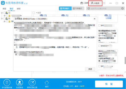 Step4:扫描结束后,我们找到自己要恢复的文件,点击预览,确认文件可不可以正常预览,确认文件可以正常预览后,勾选文件,点击恢复按钮,选择自己要保存的路径,即可恢复到电脑上。