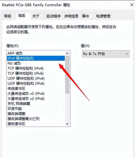 5、在高级选项页面的 属性 列表中选中“IPV4硬件校验和”(英文名:IPv4 Checksum Offload)。