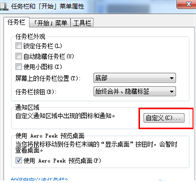 2、在打开的属性页面中的“任务栏”选项卡下,点击通知区域的【自定义】按钮。