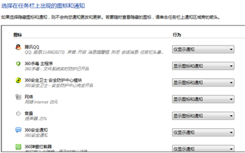 4、默认情况下我们登录的软件小图标都会在小三角里面显示了,如果有些重要的软件想直接在桌面右下角的任务栏上显示,可以选择图标行为–【显示图标与通知】。