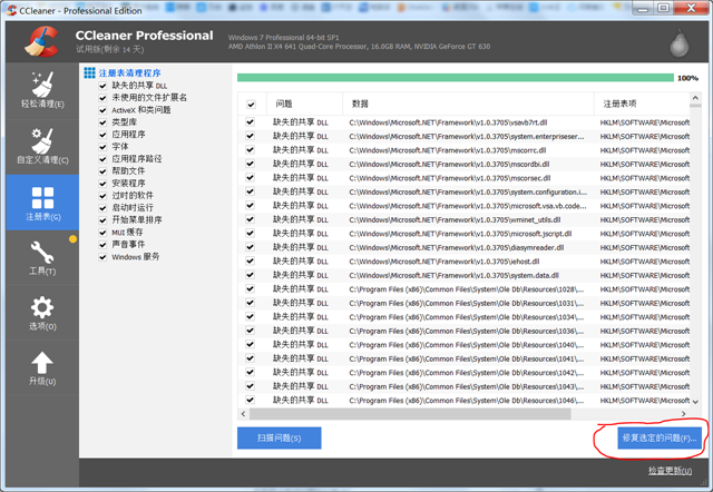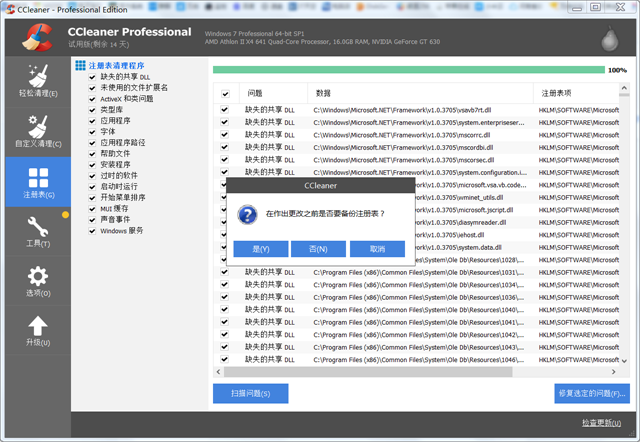 修复选定的问题。提示是否要备份注册表的时候,一定要备份一下注册表。否则系统出现问题就没有办法恢复了。