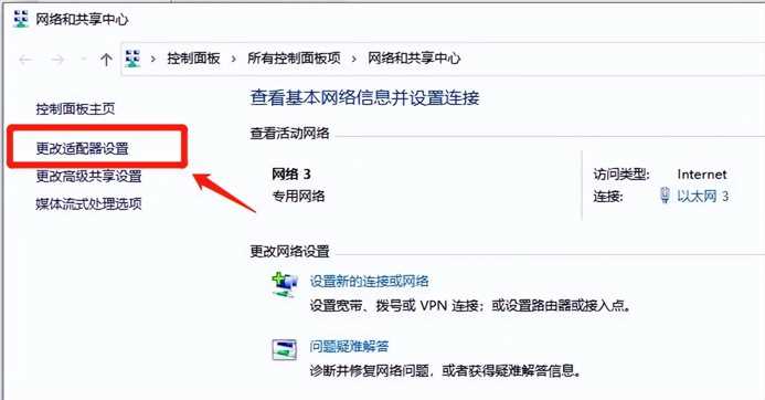 第三步:进入网络和共享中心页面,点击左侧的【更改适配器设置】。