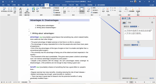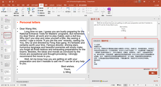 最佳答案可能很多人都不知道,微软office自带翻译功能,这个对于常用word ,ppt看课件的同学来说,好用到爆。下面演示下比如翻译这段文字怎么办呢箭头上面所指审阅两个字(菜单栏)第一步鼠标点击审阅第二部选择翻译第三步选择翻译所选内容这时右面会冒出一个分栏刚开始加载可能会很慢,稍微等等第四步选择刚刚那段要......